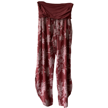 Pantalon femme en viscose fushia imprimé. légère ouverture sur bas de jambe.