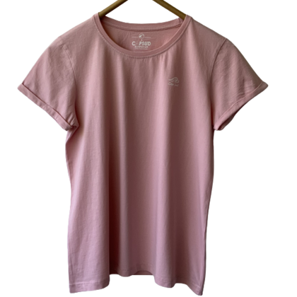 Tee-Shirt femme rose pâle, 100 % coton, petit revers sur manche, sérigraphie…