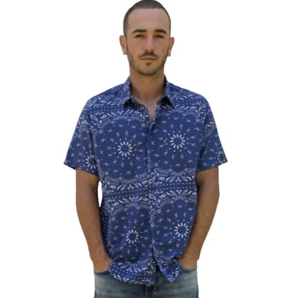 Chemise manche courte Homme. Tissu 100 % coton imprimé. Coloris Azur.